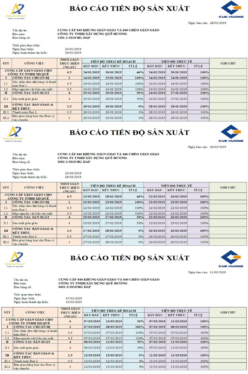 Với yêu cầu cao về mặt tiến độ, Đại An Phát đã sản xuất về đích trước thời gian yêu cầu các đơn hàng của Quê Hương, trong đó: sản xuất gần 3.000 khung giàn giáo, 5.000 kích tăng, và hàng nghìn thiết bị xây dựng khác.